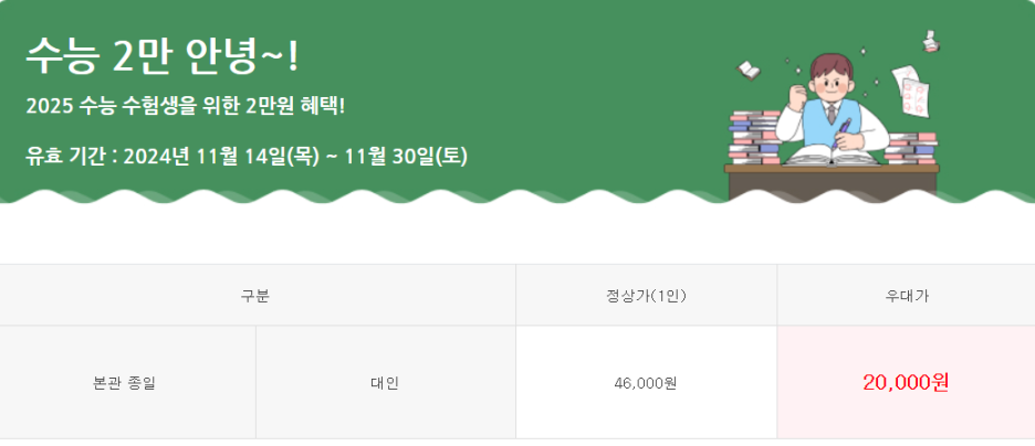 위 할인은 수험표를 제시하는 수험생에게 제공하는 특별 할인으로 수험표와 신분증을 꼭 챙기도록 하세요!