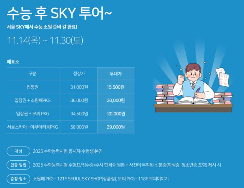수험생들을 위한 롯데월드의 혜택은 놀이공원에만 그치지 않아요. 서울 전경을 한눈에 내려다보며 특별한 시간을 보낼 수 있는 서울스카이 입장권도 할인된 가격으로 제공된답니다.