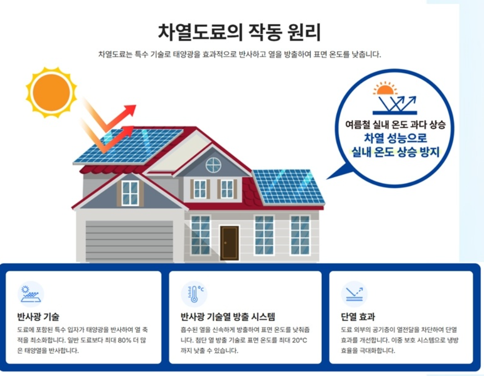 차열페인트란 태양광의 80% 이상을 반사해 건물 외벽이나 지붕의 표면 온도 상승을 막아주는 특수 도료입니다. 쉽게 말해, 태양빛을 튕겨내서 열이 실내로 전달되는 걸 차단해주는 거죠.